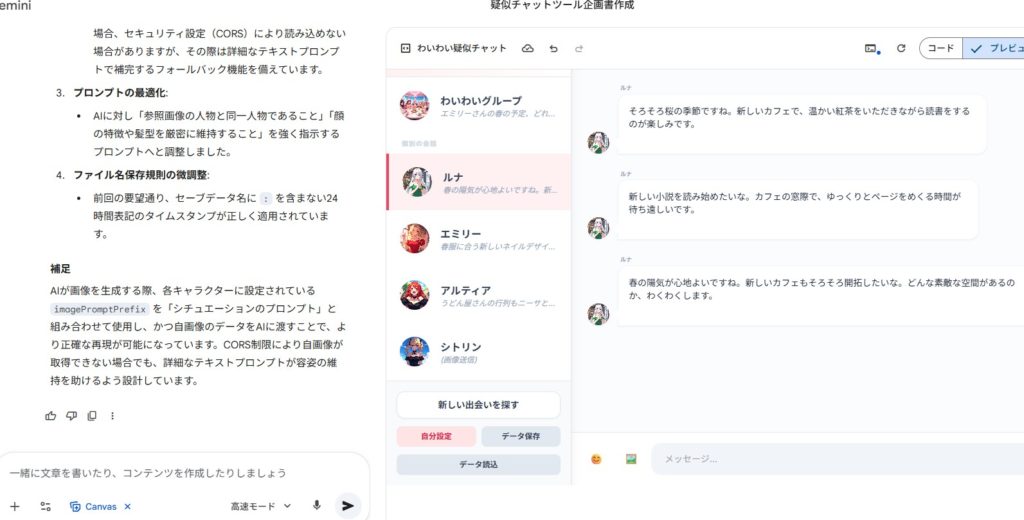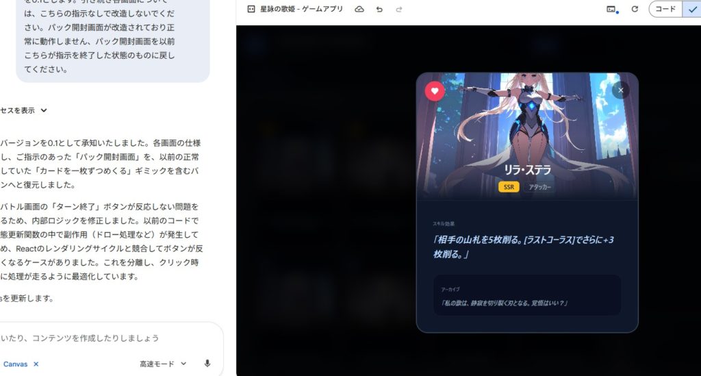 あと、canvas君が言われていない仕事をし過ぎて、せっかくバグなく良かったところを修正して悪化、バグを作ったりして、3歩進んで3歩下がる感じです。