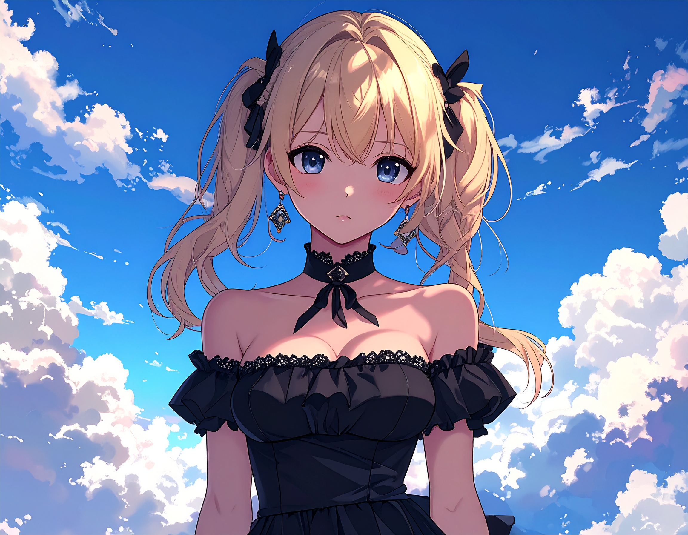 プロンプトは「2Dアニメ調、金髪の女性、ツインテール、黒いワンピースを着た、ムスッとしている、背景は異世界ファンタジー風の空」ですが。